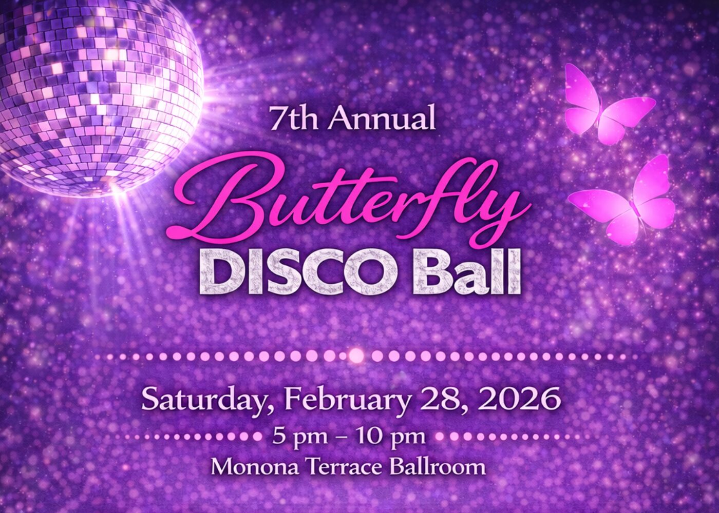 Register for FREE to access the virtual program. You can also enhance your experience with a VIP in-person evening at Monona Terrace in Madison, Wisconsin featuring a purple-carpet welcome, professional photos, signature Butterfly Martinis, live music, a 3-course dinner, special guest messages, a candlelight moment of remembrance, and a disco dance party.