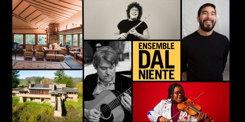 Join Ensemble Dal Niente at Frank Lloyd Wright’s Taliesin in Spring Green for a unique experience that explores the relationship between music, architecture, and nature. This musical promenade will take guests through multiple spaces within Wright’s main residence where musicians will offer site-specific instrumental improvisations – spontaneous musical dialogues that respond directly to each room’s acoustics, design, and atmosphere. Guests will move from space to space, experiencing a deeply immersive journey that blends community, architecture, and music. The evening will conclude with a wine and cheese artist reception, inviting reflection and conversation between audience members and the ensemble about the shared experience and creative process.
